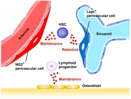 Omatsu et al. reported that short-term ablation of CAR cells in vivo impaired only the adipogenic and osteogenic differentiation potential of marrow cells [30]. However, HSCs from CAR cell-depleted mice were reduced in number and cell size, were more quiescent, and had increased expression of early myeloid selector genes, similar to the phenotype of wild-type HSCs cultured without a niche. Greenbaum et al. reported that deletion of the CXCL12 gene from CAR cells and osteoblasts resulted in constitutive HPC mobilization and a loss of B-lymphoid progenitors, with normal HSC function [31]. Moreover, CXCL12 gene deletion from endothelial cells resulted in a modest loss of long-term repopulating activity, and deletion of CXCL12 from Prx1+ cells was associated with a marked loss of HSCs, long-term repopulating activity, HSC quiescence, and common lymphoid progenitors. Thus, CXCL12 expression in stromal cells in the perivascular region can support HSCs. Ding et al. reported that deletion of CXCL12 from perivascular stromal cells depleted HSCs and certain restricted progenitors and mobilized these cells into circulation and that deletion of CXCL12 from endothelial cells depleted HSCs but not myeloerythroid or lymphoid progenitors [29]. In contrast, deletion of CXCL12 from osteoblasts depleted certain early lymphoid progenitors but not HSCs or myeloerythroid progenitors and did not mobilize these cells into circulation. However, deletion of CXCL12 gene from hematopoietic cells or nestin-cre-expressing cells had little or no effect on HSCs or restricted progenitors. Asada et al. demonstrated that CXCL12 or SCF gene deletion in all perivascular cells dramatically reduced HSCs and that the reduced NG2+ cell- but not Lepr+ cell-derived CXCL12 decreased HSC numbers and altered HSC localization in bone marrow [24]. Collectively, Lepr+ and NG2+ perivascular cells can maintain and retain HSCs cooperatively by producing CXCL12, while osteoblast-derived CXCL12 can mainly contribute to the maintenance of lymphoid progenitors [1,15] (Figure 2).