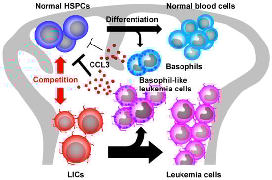 Detailed analysis on this model identified basophil-like leukemia cells and to a lesser degree, normal basophils as a source of CCL3 in CML bone marrow [43]. Similar observations were obtained on the bone marrow of patients with CML. Moreover, deletion of basophil-like leukemia cells recapitulated the phenotypes observed when CCL3-deficient BCR-ABL-transduced HSPCs were injected into the bone marrow of non-irradiated host [43]. Collectively, basophilia, a frequently observed hematological abnormality in CML patients, may not simply be an accompanying phenomenon but may have a pathogenic role in CML development, by producing abundantly CCL3, which can dampen normal HSPC but not LSC proliferation, and eventually provide LSCs with a growth advantage over normal HSPCs, particularly at the early phase of CML development (Figure 3). Thus, basophils and/or the CCL3 axis can be a novel target for CML treatment.