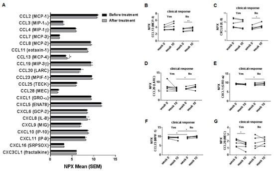 Systemic chemokine levels in 11 inflammatory bowel disease-patients previously non-responding to anti-TNF-agents before and at week 10 after induction therapy with vedolizumab. (A) Serum levels of in total 21 chemokines in IBD-patients at baseline (week 0) and after (week 10) treatment with vedolizumab analyzed by multiplexed proximity extension assay (PEA). Serum levels of individual chemokines; (B) CCL13 (MCP-4); (C) CXCL8 (IL-8); (D) CCL20 (LARC); (E) CXCL1 (GRO-α); (F) CCL23 (MPIF-1); (G) CCL28 (MEC) divided by the clinical response into responders and non-responders. Data represent normalized protein expression (NPX) in a log2 scale mean + SEM, * p < 0.05; ** p < 0.01, paired Student’s t-test; Of IBD-patients six were responders and five non-responders.