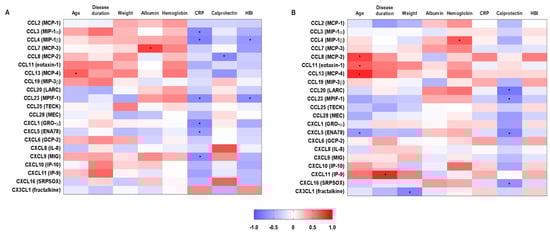 Correlations between systemic chemokine levels and clinical parameters in 11 inflammatory bowel disease-patients previously non-responding to anti-TNF-agents before and at week 10 after induction therapy with vedolizumab. Correlations between clinical and routine laboratory parameters with chemokines (A) at baseline (week 0) and (B) after treatment (week 10) with vedolizumab. * p < 0.05, Pearson correlation.