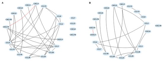 Chemokine networks in 11 inflammatory bowel disease-patients previously non-responding to anti-TNF-agents before and at week 10 after induction therapy with vedolizumab. Network was built using the correlation coefficient between each pair of chemokines, where connection lines indicate a significant correlation (p < 0.05) between chemokines (A) at baseline (week 0) and (B) after treatment (week 10) with vedolizumab. Each node represents a chemokine. The black line indicates a positive correlation and the red line indicates a negative correlation.