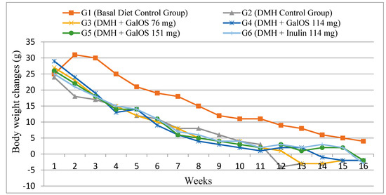 Data of weekly body weight changes are shown in Figure 1. All groups were fed on basal diet ad libitum and no significant difference was observed in food intake among all groups. Group G1 (basal diet group) gained maximum body weight (p ≤ 0.05) as compared to all other groups. DMH showed high impact on lowering body weights of DMH treated animals and the negative control Group G2 (basal diet + DMH) gained the lowest body weight as compared to all other groups. Interestingly, those animals (Groups G3–G6) receiving prebiotics as treatments showed resistance against DMH effect on hindering body weight gain. Among GalOS groups, G5 group showed significant (p ≤ 0.05) increase in body weight gain as compared to Group G2. Group G6, which was receiving inulin as treatment, gained maximum body weight among all prebiotics groups and was significantly (p ≤ 0.05) higher as compared to Group G2, however this body weight gain was statistically similar to GalOS groups (G4 and G5).