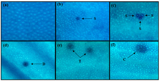 Microscopic view of the colons showing: (a) normal crypts of control animals; and (b–f) 1,2-dimethylhydrazine dihydrochloride (DMH) treated animals showing aberrant crypt foci stained with methylene blue (40×). Arrows indicate ACF: singlet (S), doublet (D), triplet (T), and cluster (C).