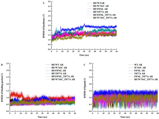 | HF/F876L_T877A AR | −24.34 | −35.36 | 39.47 | −5.19 | −25.31 | 20.79 | −4.52 |