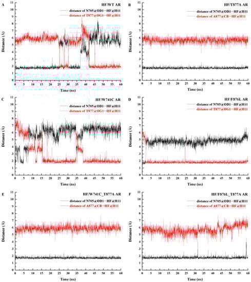 | HF/W741C_T877A AR | HF@O4-H11∙∙∙N705 (OD1) | 2.67 | 2.67 | 161.27 | 161.54 | 99.98 | 99.96 |