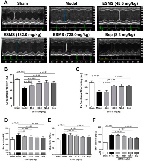 2.1. Extract of Sheng-Mai-San (ESMS) Ameliorated Cardiac Function and Decreased Myocardial Injury in Myocardial Ischemia (MI)-Induced Heart Failure (HF) Mice