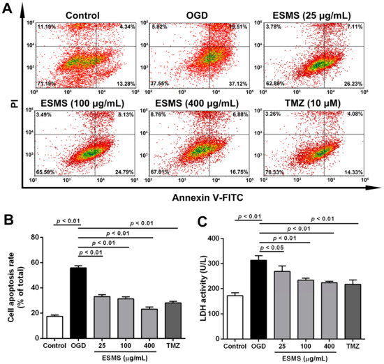 2.5. ESMS Decreased Cardiomyocyte Injury and Apoptosis in H9c2 Cells Subjected to Oxygen Glucose Deprivation (OGD)