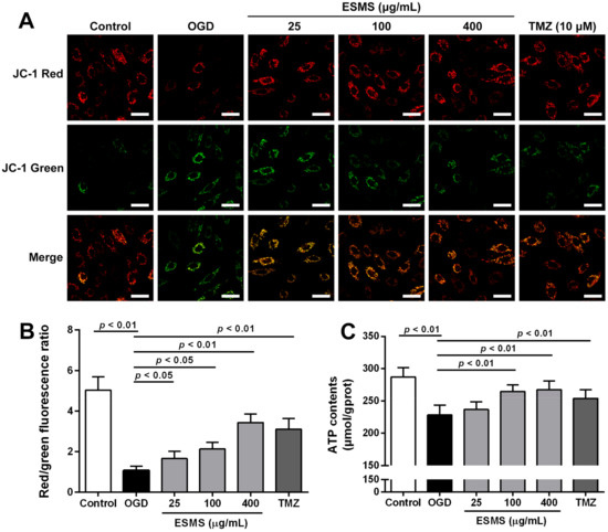 2.7. ESMS Restored Mitochondrial Membrane Potential and Cellular ATP in H9c2 Cells Subjected to OGD