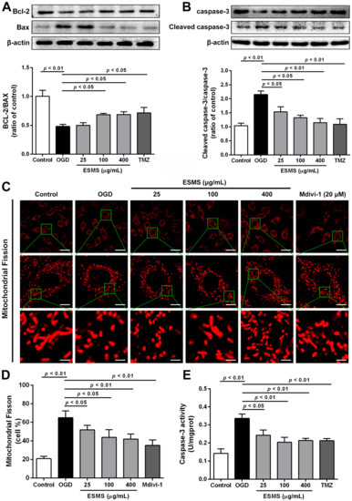 2.8. ESMS Ameliorated the Expression of Mitochondrial Mediated Apoptosis Proteins and Reduced the Caspase-3 Activity in H9c2 Cells Subjected to OGD