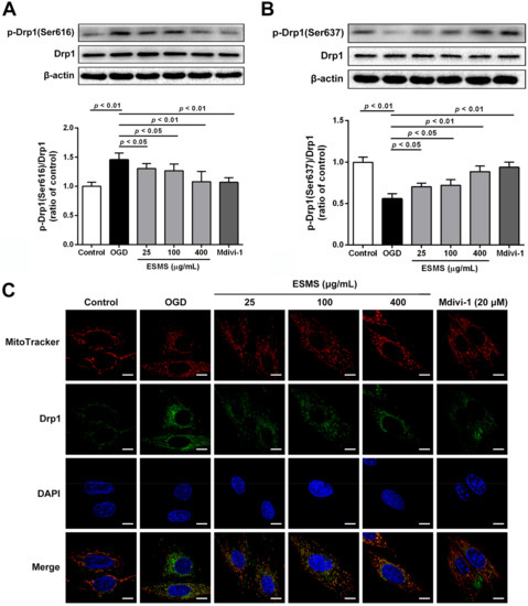 2.9. ESMS Inhibited Mitochondrial Fission and Regulated Drp1 Phosphorylation and Translocation