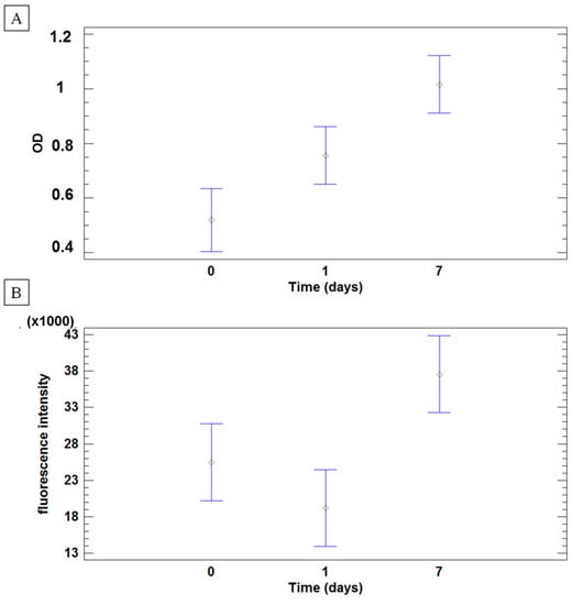Analysis of hASCs metabolic activity (two cell lines) was performed by both MTT (3-(4,5-Dimethylthiazol-2-yl)-2,5-diphenyltetrazolium bromide) and AlamarBlue assays on five batches of FAMs at 3 time points: day 0 (2 h after cell-microcarrier incubation), 1, and 7 days from cell seeding. Mean values and 95.0% least significance difference (LSD) intervals are reported in Figure 8 as optical density (OD, Figure 8A) and fluorescence (Figure 8B) for MTT Assay and Alamar Blue, respectively, during the culture time. Analyses revealed that both OD and fluorescence intensity depend on culture time (p values: 0.0002 and 0.0038, respectively). No significant effect was observed between the two cell lines (p values: 0.1024 and 0.6042, respectively for OD and fluorescence intensity). Moreover, the batch of FAMs did not influence the hASCs metabolic activity (p > 0.05). Results of both metabolic assays clearly suggest that no differences were observed after 2 h of stirring (0 day) and 1 day of culture, but hASCs were able to proliferate on the FAM.