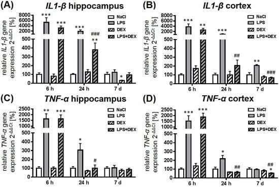 2.1. Dexmedetomidine-Attenuated, LPS-Induced IL1-β and TNF-α Gene Expression in the Hippocampus and Cortex