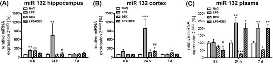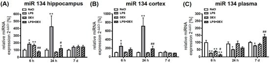 2.2. Dexmedetomidine Modulated the miRNA Expression in the Hippocampus, Cortex, and Plasma of LPS Treated Rats