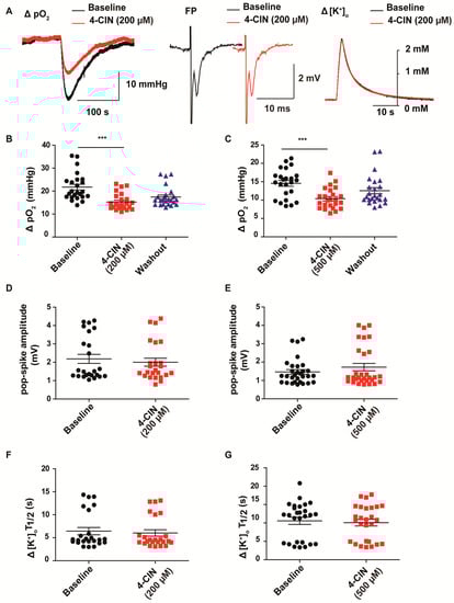 Effects of monocarboxylate transporter (MCT) inhibition by α-cyano-4-hydroxycinnamic acid (4-CIN) on stimulus induced extracellular tissue oxygen changes (ΔpO2), field potential responses (FP), amplitude and recovery kinetics of extracellular K+ concentration changes (Δ[K+]O). Despite the clear effect on the stimulus induced pO2 changes neither recovery kinetics of Δ[K+]O nor field potential amplitude were affected by 4-CIN. (A) Sample traces of ΔpO2 (left), field potential transients (middle) and Δ[K+]O (right) in the presence and the absence of 4-CIN. Inhibition of the MCTs decreased ΔpO2 both at (B) 200 µM and (C) 500 µM 4-CIN concentration, (D,E) whereas it did not affect field potential amplitude and (F,G) first half recovery time of Δ[K+]O for both concentrations, respectively; (B–G) Variables are given on the Y-axis, categories of treatment on the X-axis. *** p < 0.001.