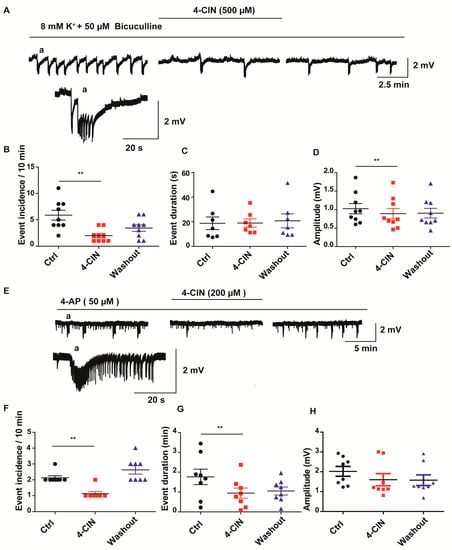 Effects of 4-CIN on spontaneous recurrent epileptiform activity induced by elevated potassium plus bicuculline in cortical slices from mesial temporal lobe epilepsy patients (mTLE) or by 4-AP in rat medial entorhinal cortex (MEC) slices. (A) Sample field potential trace representing recurrent SLEs during induction (left) 4-CIN application (middle) and wash out (right) in neocortical slices from mTLE patients, the (a) excerpt showing a single seizure like event on different time scale; (B) Application of 4-CIN significantly decreased incidence of SLEs (C) without affecting event duration (D) but also decreased FP amplitude; (E) Sample field potential trace during seizure induction (left) 4-CIN application (middle) and wash out (right) in MEC slices from rat, (a) the excerpt showing a single seizure like event on different time scale; (F) Application of 4-CIN decreased incidence and (G) duration of SLEs without affecting (H) amplitude. (B–D,F–H) Variables are given on the Y-axis, categories of treatment on the X-axis. ** p < 0.01. Each dot represents a single data point, black dots represent control condition (seizure induction), red dots represent 4-CIN application on top of seizure inducing drugs, and blue dots represent washout phase.