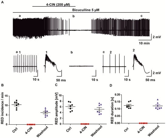 In order to exclude that the observed anti-seizure effect would depend on the type of pro-convulsive treatment (bicuculline in human, 4-AP in rat), we also extended the study to bicuculline induced epileptiform activity in rat hippocampus slices. Inhibition of GABAA receptors have been shown to induce recurrent epileptiform discharges (REDs) of shorter duration rather resembling interictal burst activity than of the SLEs induced by 4-AP []. By applying 5 µM bicuculline, we were able to induce REDs in the area CA3 with an amplitude of 6.1 ± 1.4 mV (Figure 3A,C), duration of 124 ± 7 ms (Figure 3A,D) and incidence of 10.4 ± 1.8/min (Figure 3B; n = 7, 3 rats). Application of 200 µM 4-CIN completely ceased REDs. During washout the incidence partially recovered while the amplitude and duration undertook complete recovery (Figure 3A–D). Thus blocking lactate uptake exerts an anti-seizure effect irrespective of the proconvulsive treatment (4-AP, bicuculline, bicuculline plus elevated potassium), species and anatomical structure (human neocortex vs. rat entorhinal cortex—hippocampus slices) as well as the type of the tissue (chronic epileptic vs. healthy control).