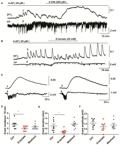 Effect of MCT inhibitors—4-CIN and d-lactate—on baseline and SLE-associated changes in extracellular pH. Extracellular H+ ion concentration was measured using ion sensitive electrodes; hence the displayed traces show change in H+ ion concentration which got converted to pH units. (A) Application of 4-CIN resulted in a late onset baseline acidotic shift; (B) In contrast, application of sodium d-lactate (20 mM, osmolality and pH set as in normal aCSF) did not induce changes in baseline pH while exerting similar inhibitory effects on 4-AP induced epileptic form activity; (C) Sample trace of single SLE with corresponding pH change in different time scale. Each individual SLE was associated with small acidotic shifts in both 4-CIN (1,2) and d-lactate (3,4) experiments, traces taken from the recordings in (A,B) as shown by the corresponding number; (D) SLE incidence and (E) duration (F) but not the amplitude were significantly decreased; (D–F) Variables are given on the Y-axis, categories of treatment on the X-axis. * p < 0.05. Each dot represents a single data point, black dots represent 50 µM 4-aminopyridine (4-AP) application, red dots represent 20 mM d-lactate and 50 µM 4-AP application, blue dots represent washout in 50 µM 4-AP.