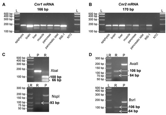 The identity of the amplification product of each receptor was successfully confirmed by restriction analysis (Figure 1C,D). Restriction reaction using the restriction enzymes XbaI or NspI and AvaII or BsrI resulted in defined fragments of Cnr1 amplification products with 100 bp and 66 bp or 93 bp (Figure 1C) molecular sizes and of Cnr2 amplification products with 64 bp and 106 bp (Figure 1D).