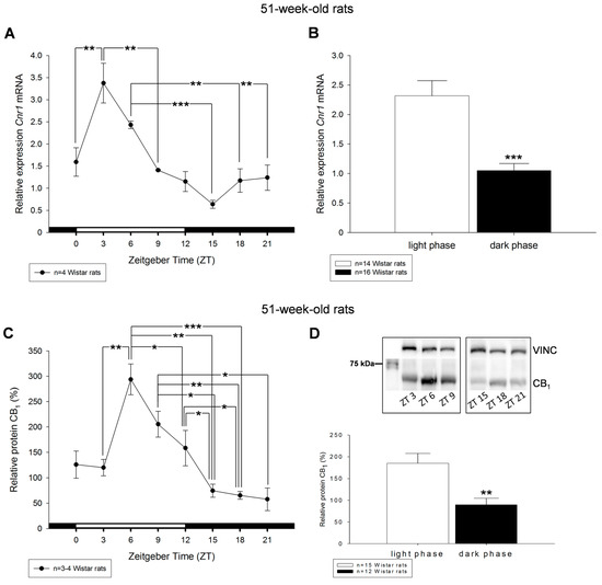 Diurnal profiles of cannabinoid receptor Cnr1 mRNA (A) and CB1 protein (C) in liver of 51-week-old rats are shown. Diurnal differences were analyzed by Mann–Whitney test; * p < 0.05, ** p < 0.01, *** p < 0.001. Values of light phase as well as those of dark phase are summarized for Cnr1 mRNA (B) and CB1 protein (D). The insets in (D) illustrate the detection of single band of 64 kDa of CB1 via Western blotting in liver tissue obtained from the middle of the day respective night. Vinculin (VINC) was used as control protein.
