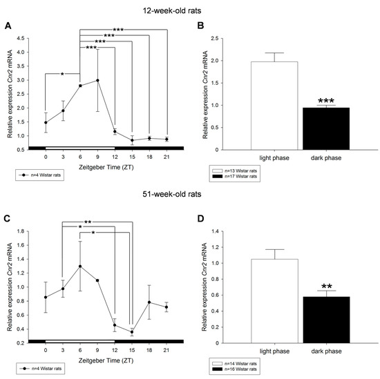 Diurnal profiles of cannabinoid receptor Cnr2 mRNA expression in liver of 12-week-old (A) and 51-week-old (C) rats are shown. Diurnal differences were analyzed by Mann–Whitney test; * p < 0.05, ** p < 0.01, *** p < 0.001. Values of light phase as well as those of dark phase are summarized for Cnr2 mRNA in 12-week-old (B) and 51-week-old rats (D).
