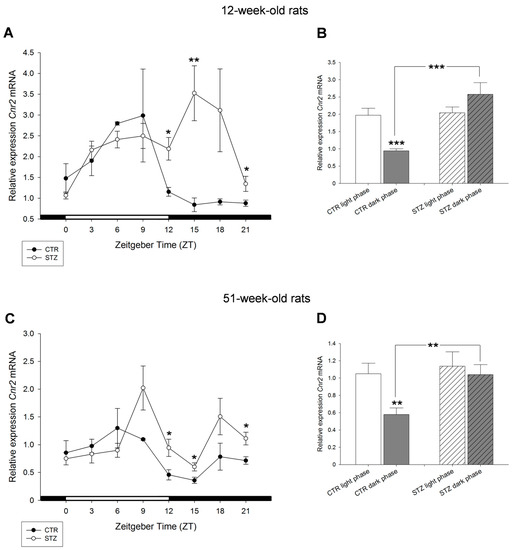 The comparison of diurnal profiles of Cnr2 mRNA of 12- and 51-week-old control and STZ rats showed significant differences during the dark phase. Significantly increased levels of Cnr2 mRNA were detected in STZ animals of both ages at ZT12 and ZT15 when compared to controls (Figure 7A,C). Cnr2 mRNA was significantly increased during dark phase in diabetic rats compared to control. Interestingly, the day–night variations of Cnr2 observed in control animals were not present in STZ rats (Figure 7B,D).