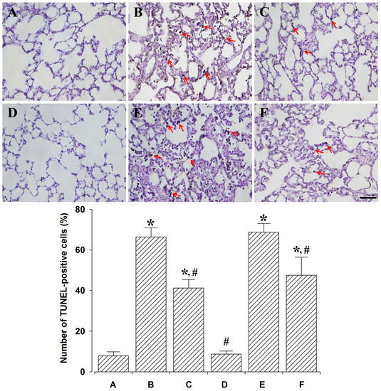 Effect of polydeoxyribonucleotide (PDRN) treatment on the percentage of terminal deoxynucleotidyl transferase-mediated dUTP nick end labeling (TUNEL)-positive cells. Upper: Photomicrographs of TUNEL-positive cells. The scale bar represents 100 μm. Red arrows represent TUNEL-positive cells. (A) Control and 24 h after sacrifice group; (B) Lung injury and 24 h after sacrifice group; (C) Lung injury with PDRN-treatment and 24 h after sacrifice group; (D) Control and 72 h after sacrifice group; (E) Lung injury and 72 h after sacrifice group; (F) Lung injury with PDRN-treatment and 72 h after sacrifice group. Lower: Percentages of TUNEL-positive cells. * represents p < 0.05 compared to the control and 24 h after sacrifice group. # represents p < 0.05 compared to the lung injury and 24 h after sacrifice group.