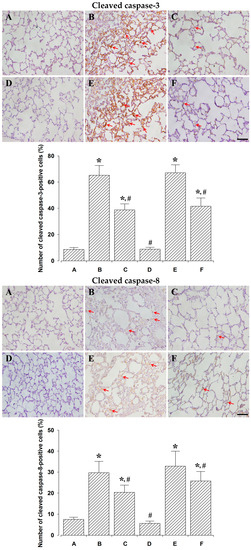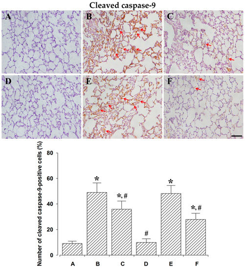 The effect of polydeoxyribonucleotide (PDRN) treatment on the percentages of cleaved caspase-3-, -8-, -9-positive cells. Upper: Cleaved caspase-3-positive cells. (Top) Photomicrographs of cleaved caspase-3-positive cells. (Down) Percentages of cleaved caspase-3-positive cells in each group. Middle: Cleaved caspase-8-positive cells. (Top) Photomicrographs of cleaved caspase-8-positive cells. (Down) Percentages of cleaved caspase-8-positive cells in each group. Lower: Cleaved caspase-9-positive cells. (Top) Photomicrographs of cleaved caspase-9-positive cells. (Down) Percentages of cleaved caspase-9-positive cells in each group. The scale bar represents 100 μm. Red arrows represent cleaved caspase-positive cells. (A) Control and 24 h after sacrifice group; (B) lung injury and 24 h after sacrifice group; (C) lung injury with PDRN-treatment and 24 h after sacrifice group; (D) control and 72 h after sacrifice group; (E) lung injury and 72 h after sacrifice group; (F) lung injury with PDRN-treatment and 72 h after sacrifice group. * represents p < 0.05 compared to the control and 24 h after sacrifice group. # represents p < 0.05 compared to the lung injury and 24 h after sacrifice group.