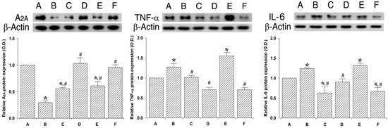 Effect of polydeoxyribonucleotide (PDRN) treatment on the adenosine A2A receptor, tumor necrosis factor-α (TNF-α), and interleukin-6 (IL-6) expressions. Actin was used as an internal control (46 kDa). Upper: The results of ban detection using the enhanced chemiluminescence (ECL) detection kit. (A) Control and 24 h after sacrifice group; (B) Lung injury and 24 h after sacrifice group; (C) Lung injury with PDRN-treatment and 24 h after sacrifice group; (D) Control and 72 h after sacrifice group; (E) Lung injury and 72 h after sacrifice group; and (F) Lung injury with PDRN-treatment and 72 h after sacrifice group. Lower: The relative expressions of adenosine A2A receptor (left), TNF-α (middle), and IL-6 (right) in each group. * represents p < 0.05 compared to the control and 24 h after sacrifice group. # represents p < 0.05 compared to the lung injury and 24 h after sacrifice group.