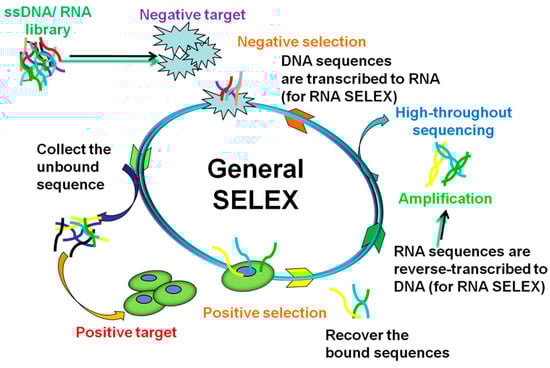 Cell-SELEX is aimed at developing a novel aptamer for the whole cell. The main steps of Cell-SELEX are similar to traditional SELEX, which includes incubation, partitioning and amplification. To generate aptamers that can specifically bind to target cells, a library is synthesized. The pool is incubated with the target cells as positive selection, then the unbound sequences are washed away and only the bound library is collected. Further, negative selection is carried out by incubating the recovered bound sequences with negative control cells, and only the unbound library is recovered for PCR []. In the case of RNA SELEX, the single-stranded RNA library is prepared by in vitro transcription of dsDNA templates, usually using recombinant T7 RNA polymerase. In DNA SELEX, the library is often prepared by PCR products. After 20 rounds of selection, the evolutionary library is sequenced by high-throughput sequencing [].
