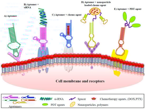 Antibodies are the most widely used targeted ligands by virtue of their high specificity and ample availability. However, they have been found to elicit immunogenicity []. Therefore, aptamers with their ability to efficiently target specific cancer cells and tissue are being given due consideration as an alternative to existing antibodies. Aptamer-mediated active tumor targeted therapy could be classified into eight groups: aptamers as drugs, aptamer–small interfering RNA (siRNA) conjugates, aptamer–locked nucleic acid (LNA) conjugates, aptamer–anti-microRNAs (miRNAs) conjugates, aptamer–chemotherapy agent conjugates, aptamer–nanoparticles (NPs) conjugates, aptamer–photo dynamic therapy (PDT) agent conjugates, aptamer-mediated immunotherapy. General paradigms that have appeared most frequently in the recent literatures are graphically represented in Figure 2.