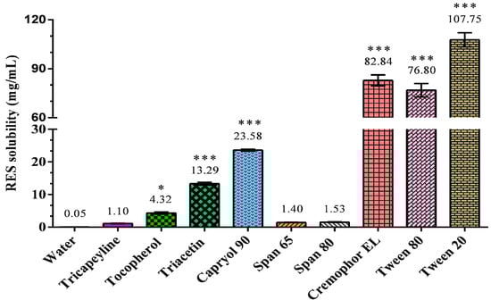 Solubility of resveratrol (RES) in different solvents. Results were expressed as mean ± standard error of the mean (n = 3 for each group). * p < 0.05 compared with water group. *** p < 0.001 compared with water group.
