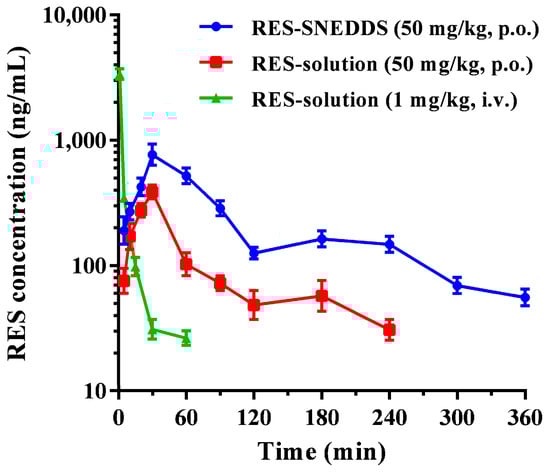Animal experimental protocols were reviewed and approved by the Institutional Animal Care and Use Committee (IACUC-104042, approval date: 13 July 2015) of Kaohsiung Medical University Hospital (Kaohsiung, Taiwan). Sprague-Dawley rats weighing 250 ± 50 g were used for the study, which were obtained from BioLASCO Taiwan Co., Ltd. (Taipei, Taiwan). Rats were randomly assigned into three groups (n = 5 for each group). For the intravenous group, each rat was given the RES-solution (Dose: 1 mg/kg) through the femoral vein. Blood samples were collected as blank plasma before drug administration, and further blood samples were collected at 1, 5, 15, 30, and 60 min after administration. For the oral group, RES-SNEDDS were administered by gastric gavage (Dose: 50 mg/kg) and RES-solution (Dose: 50 mg/kg) which suspended in 0.25% (w/v) carboxyl methyl cellulose aqueous solution was used to be control group. Blood samples were collected at 5, 10, 20, 30, 60, 90, 120, 180, 240, 300 and 360 min after administration. An aliquot of 300 µL blood plasma was withdrew manually via the jugular vein catheter and placed into a vial rinsed with heparin. Each blood plasma was centrifuged at 3000 rpm for 10 min and plasma fraction was separated and directly precipitated before HPLC analysis. Briefly, An aliquot of 100 µL plasma were mixed with an equal volume mixture of acetonitrile and 6% (w/v) perchloric acid (60:40, v/v), and then vortex-mixed for 1 min to precipitate protein molecules. The supernatant was collected after centrifugation at 10,000 rpm for 10 min and was then filtered through a 0.22-µm syringe filter prior to HPLC analysis.