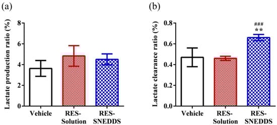 The lactate production ratio in the vehicle, RES-solution, and RES-SNEDDS was 3.63 ± 1.87, 4.83 ± 2.42, and 4.50 ± 1.30, respectively (Figure 5a), and the corresponding lactate clearance ratio was 0.47 ± 0.09 0.46 ± 0.05, and 0.66 ± 0.06 (Figure 5b). The relationships between lactate accumulation and work intensity and capacity as well as the correlation between lactate accumulation and muscular fatigue have long been a major research topic []. During high-intensity exercise, the muscles produce large quantities of lactate through anaerobic glycolysis-induced energy production. A high lactate level reduces the pH, which in turn induces various biochemical and physiological side effect [].