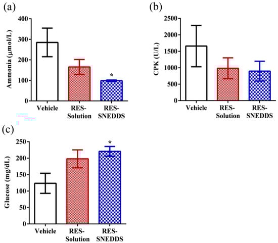 The plasma ammonia level in the vehicle, RES-solution, and RES-SNEDDS was 284.8 ± 69.7, 165.4 ± 36.4, and 98.6 ± 3.6 µmol/L, respectively (Figure 6a). Ammonia is a major protein and an amino-acids metabolite. During exercise, the muscles rapidly produce ammonia because of adenosine monophosphate deamination []; this increase in ammonia during exercise has been linked to peripheral and central fatigue []. In rats pretreated with the RES-SNEDDS before exercise, the plasma ammonia level decreased significantly (by 65.4%) compared with that in the vehicle group, whereas no significant differences were observed between the RES-solution and vehicle groups. The plasma creatinine phosphokinase (CPK) level in the vehicle, RES-solution, and RES-SNEDDS was 1658.2 ± 627.3, 983.4 ± 316.5, and 895.6 ± 300.7 U/L, respectively (Figure 6b). CPK is a clinical biomarker for muscle damage []. The result indicated that CPK in the RES-SNEDDS decreased by 46.0% compared with that in the vehicle group; however, CPK did not differ in both groups because of the large standard error of the mean.