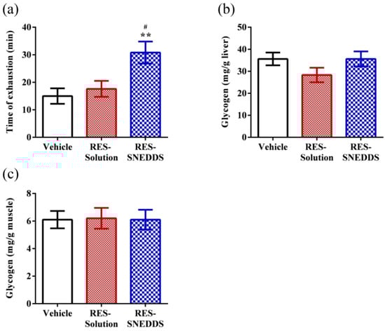 Effect of resveratrol (RES) on: (a) exhaustive swimming test; and glycogen content in: (b) liver; and (c) muscle. Data are expressed as mean ± standard error of the mean (n = 5 for each group). ** p < 0.01 compared with vehicle group. # p < 0.05 compared with RES-solution group.