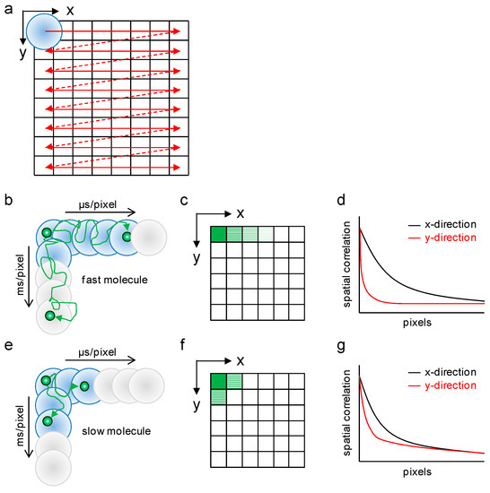 The principle of laser scanning microscopy (LSM) imaging for raster image correlation spectroscopy (RICS) analysis. (a) LSM images consist of pixels from line-by-line scanning. The detectable fluorescent signal (blue circles) and undetectable cases (gray circle) of: (b) fast; and (e) slow moving molecules (green circles) from scans result in the LSM image ((c,f), respectively). The spatial correlation of: (d) fast; and (g) slow moving molecules. Black and red lines represent the correlations calculated from the x- and y-direction pixels, respectively.