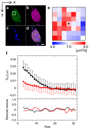 RICS has been applied to analyze membrane proteins [25,26], DNA [27], and other biomolecules [28,29] because it provides the spatial distribution of the diffusional coefficients in the diffusion map [27,30]. Each brick constituting the diffusion map showed the diffusion property of biomolecules contained in each microdomain. This mapping analysis in RICS, in other words, has a multipoint diffusion analysis in one of the most useful and easiest methods for quantifying the heterogeneous distribution of biomolecules in live cells.