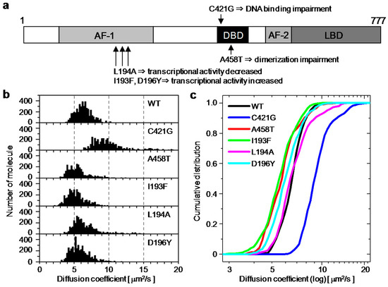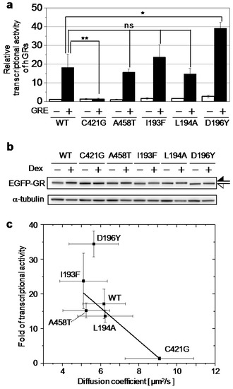 2.2. Relationship between the Diffusion Property and Transcriptional Activities of GR Wild Type and Mutants