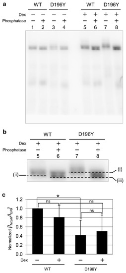 As shown in Figure 4b (upper) and Figure S4, the mobilities of bands corresponding EGFP-hGRD196Y (white arrow) shifted slightly more than those of EGFP-hGR wild type and other mutants (black arrow). By combining the results of this shift and higher transcriptional activity of EGFP-hGRD196Y, hyper-phosphorylation of EGFP-hGRD196Y was suggested because phosphorylation could affect the transcriptional activity of GR. Therefore, the phosphorylation state of EGFP-hGRWT and EGFP-hGRD196Y was analyzed by Phos-tag electrophoresis (Phos-tag PAGE). As shown in Figure 5a, lanes 1–4, in the absence of Dex, similar mobility for bands was observed for EGFP-hGRWT and EGFP-hGRD196Y both in the presence and absence of the phosphatase. This result shows that both EGFP-hGRWT and EGFP-hGRD196Y were not phosphorylated before stimulation by Dex. Conversely, after stimulation with Dex as shown in Figure 5b, the bands for both EGFP-hGRWT and EGFP-hGRD196Y were shifted by addition of a phosphatase (from lane 5 to 6 and from lane 7 to 8, respectively). Moreover, the band shift caused by dephosphorylation of EGFP-hGRD196Y corresponding to the shift from (i) to (iii) was greater than that of EGFP-hGRWT corresponding to the shift from (ii) to (iii). This result indicates that EGFP-hGRD196Y was hyper-phosphorylated compared to EGFP-hGRWT.