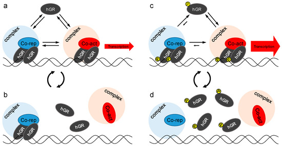 The model of effect of hyper-phosphorylation on transcriptional activity and mobility of hGR. Transcriptional activation is initiated by binding hGR to GBR but controlled by association with the coactivator and corepressor complex. The observed diffusion coefficient was reflected in the total states of hGR. (a,b) Restricting the mobility of hGR by association with the corepressor complex resulted in a lower diffusion coefficient; (c,d) hyper-phosphorylation of hGR reduced association with the corepressor complex; thus, the transcriptional activity and diffusion coefficient were increased. Co-rep (blue) and Co-act (red) represent the corepressors (such as NCoR) and coactivators (such as GRIP1), respectively. The light blue and red circles are the complex of corepressor and coactivator, respectively. The hGR with a “P” in yellow circle on it represents hyper-phosphorylation.