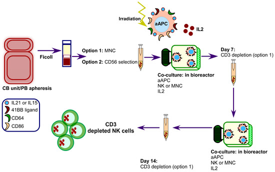 Clinical expansion of Natural Killer (NK) cells from apheresis products or cord blood (CB) units. Activated NK cells can be generated starting either from mononuclear cells (MNC) or with magnetically selected NK cells. First, either CB or apheresis products are ficolled to get the MNC, and then they are either added directly to a bio-reactor or subjected to magnetic CD56+ selection. These CD56+ cells will be added to the bio-reactor. Then, they are expanded in vitro for seven days with artificial antigen presenting cells (aAPCs). IL2 is added exogenously every other day. aAPCs are K562-based aAPCs expressing 41BB ligand, CD64, CD86 and either membrane bound IL21 or IL15. They are co-cultured in a 2:1 aAPC:MNC or NK cells ratio. On Day 7, fresh aAPCs are added again in the same ratio and co-cultured in the same conditions for an additional seven days. On Day 7 and Day 14, cells are CD3-depleted, only in case the expansion was started with MNC. Expansion can be continued for a total of 4 weeks repeating the same procedure. PB: peripheral blood.