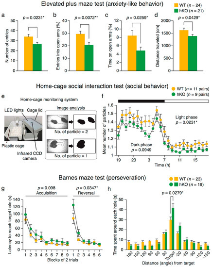 Male hKO and WT mice were housed in groups of four per cage (two KO and two WT animals per cage). Mice with hydrocephalus were not used for the behavioral tests. The mice were kept in a room with a 12 h light/dark cycle (lights on between 07:00 and 19:00) and allowed free access to food and water. Behavioral tests were performed between 09:00 and 18:00 when the mice were 10–42 weeks of age. Test sequence of the behavioral test battery is shown in Table S1.