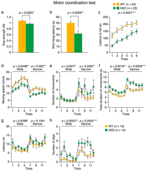 Another feature observed in some ASD patients is a deficit in motor coordination [4,6]. Hence, we assessed muscular strength and motor coordination in Arid1b hKO mice (Figure 2). Grip strength and the latency of falling off the wire mesh in the wire hang test were significantly lower in the hKO mice (Figure 2a,b). In the rotarod test, the latency of falling off the accelerating rotating rod was significantly lower in hKO mice than in WT mice (Figure 2c). In the balance beam test, Arid1b hKO mice exhibited slower movement speed (Figure 2d), longer duration of movement (Figure 2f), and a higher number of slips when crossing wide or narrow beams (Figure 2h). The number of movements was significantly higher on the narrow beam (Figure 2e), and the latency of reaching the goal was significantly larger on the wide beam (Figure 2g) in hKO mice. Together, these results indicate that the hKO mice had reduced muscular strength and deficits in motor coordination.