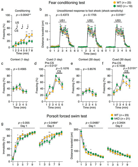 Although the hKO mice exhibited impaired motor performance and reduced locomotor activity in novel environments (Figure 1a–d, Figure 2 and Figure S3e,f,h), exposure to intense stimuli such as electric foot shock or forced swim stress induced larger locomotor responses in hKO mice than in WT mice (Figure 3). In the fear conditioning test, hKO mice traveled longer distances both during and immediately after foot shock, an index of pain sensitivity (Figure 3b). Moreover, hKO mice were more active than WT mice in the Porsolt forced swim test (Figure 3h). These results indicate that hKO mice had an increased response to strong stimuli such as electro-shock and water immersion.