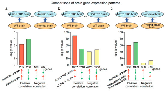 Comparison of brain gene expression patterns in Arid1b hKO mice with other genomic data. (a) Comparison of brain gene expression patterns in Arid1b hKO mice with those in autistic patients; (b) Chd8-haploinsufficient mice, and (c) fast-spiking cells in 7-day-old mouse pups. Arrows show up regulated gene group (red) or down regulated gene group (green).