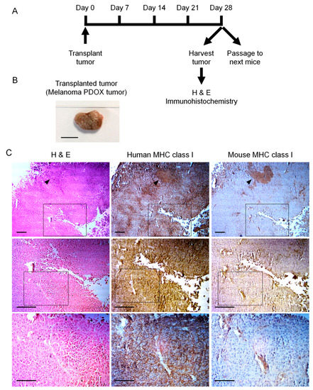 (A) Experimental scheme; (B) Patient-derived orthotopic xenograft (PDOX) melanoma after 28 days of growth, Scale bar: 10 mm; (C) hematoxylin and eosin- (H&E)-stained tumor sections (left column), human MHC class I (HLA; middle column) immunohistochemistry, mouse MHC class I (right column), mouse MHC immunohistochemistry. The human cancer cells expressed human MHC class I and the mouse stromal cells and blood vessels expressed mouse MHC. Magnified views of boxed region in the upper rows are indicated at the middle rows and magnified views of boxed region in the middle rows are indicated in the lower rows. Scale bars: 200 μm (top and middle row), 100 μm (bottom row) [34].