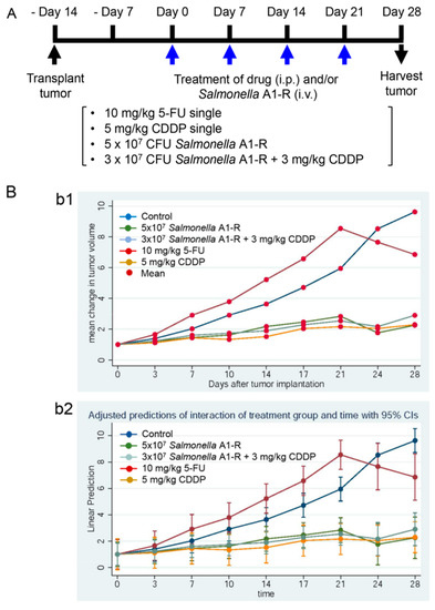 Efficacy of S. typhimurium A1-R, 5-fluorouracil (5-FU) and cisplatinum (CDDP) on a melanoma PDOX model. (A) Experimental scheme; (b1) mean change in tumor volume plotted against time, as shown in untreated and control tumors; (b2) linear prediction versus time curves for untreated control and treated tumors; (C) body weight comparison in nude mice after S. typhimurium A1-R and/or 5-FU and CDDP therapy [34]. ** p < 0.01, compared with the untreated control group.