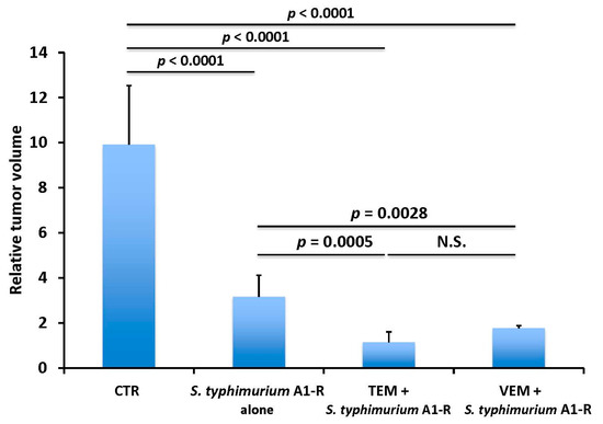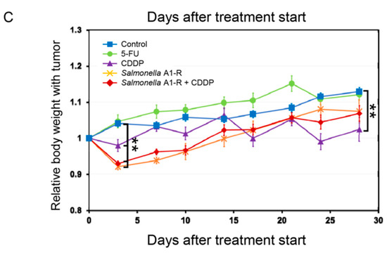 S. typhimurium A1-R (AntiCancer Inc.), expressing GFP, was cultured in LB medium (Fisher Sci., Hanover Park, IL, USA) and harvested at the late-log phase. The bacteria were washed and diluted with PBS. S. typhimurium A1-R was injected intravenously. A total of 5 × 107 colony-forming units (CFU) of S. typhimurium A1-R in 100 μL phosphate-buffered saline (PBS) was administered to each mouse [36,37,38,56].