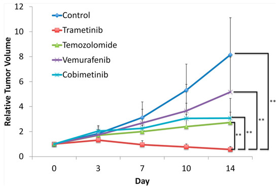 A BRAF-V600E mutant melanoma PDOX was established. VEM, temozolomide (TEM), trametinib (TRA) and cobimetinib (COB) were all effective against it. TRA treatment caused tumor regression (Figure 3). The PDOX was expected to be sensitive to VEM, since VEM targets the BRAF-V600E mutation. However, in this case, TRA was much more effective than VEM [55]. This result shows that the BRAF-V600E mutation is probably not a major factor in promoting this melanoma, and that genomic profiling by itself is insufficient to direct therapy.