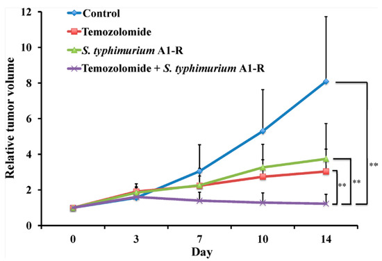 - Kawaguchi, K.; Igarashi, K.; Murakami, T.; Chmiewloski, B.; Kiyuna, T.; Zhao, M.; Zhang, Y.; Singh, A.; Unno, M.; Nelson, S.D.; et al. Tumor-targeting Salmonella typhimurium A1-R combined with Temozolomide regresses malignant melanoma with a BRAF-V600 mutation in a patient-derived orthotopic xenograft (PDOX) model. Oncotarget 2016, 7, 85929–85936. [Google Scholar] [PubMed]